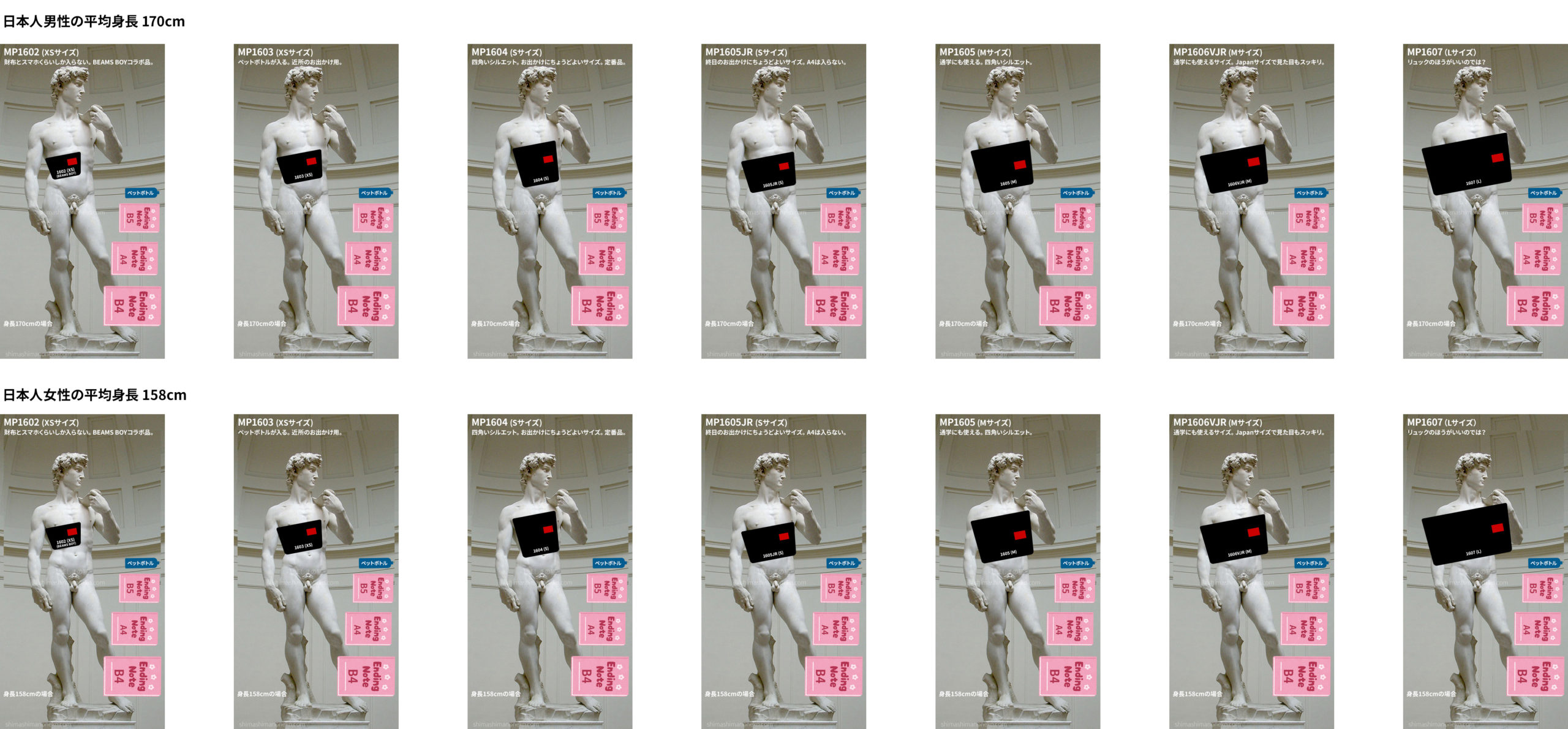 Numbers don’t help decide. Does a bottle fit? A4 sheets? Commuting? I was torn between XS and S, so I made scale images: average-height JP male/female, bags to scale, and A4, etc., from smallest up. Female versions are below.